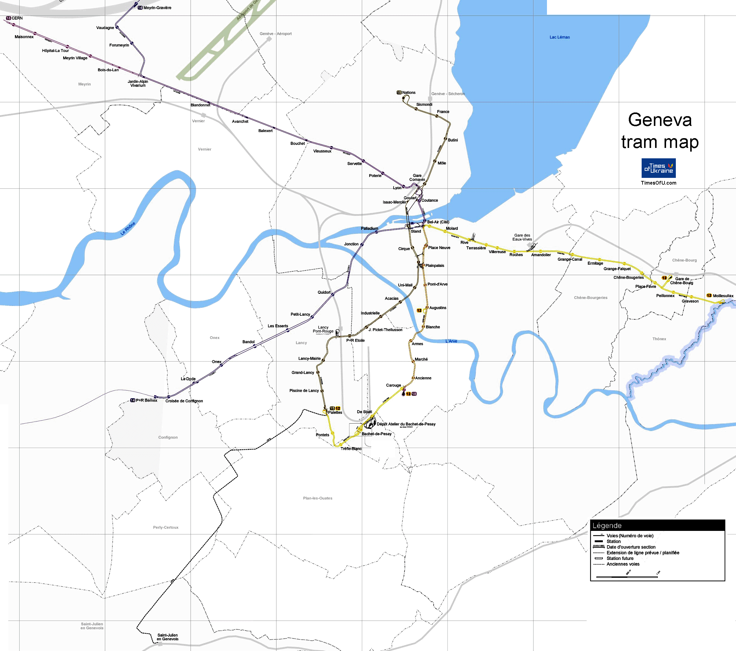 Карта маршрутов трамваев Женевы - Geneva tram map |