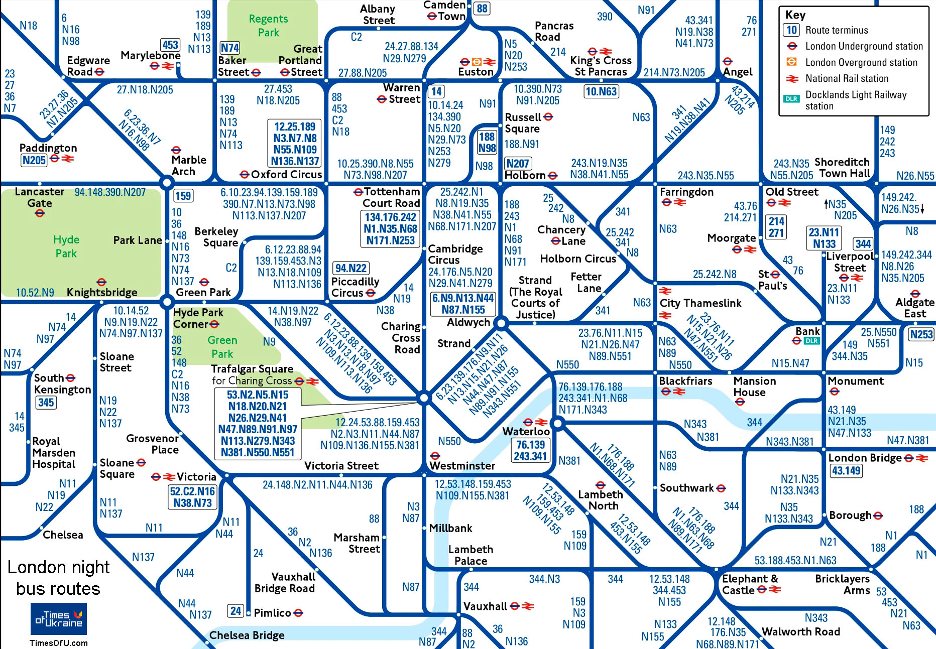 Карта ночных маршрутов автобусов Лондона - London night bus routes map |